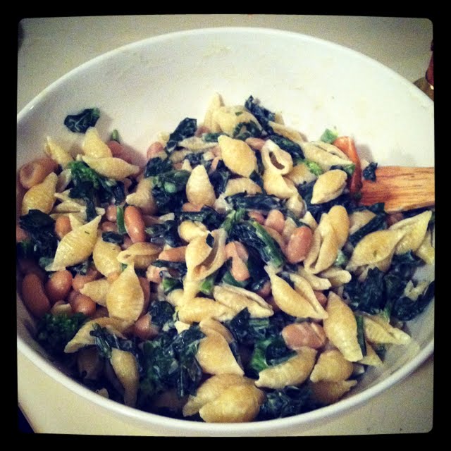 Prepare pasta as usual. In the meantime, heat some olive oil in a skillet over medium/medium high heat, and in the minced garlic and almost immediately add the Chinese broccoli, leaves sliced into like 1/2 inch pieces and stems chopped finely, so that the garlic doesn't burn. Cook until tender, then add the beans and let them warm through. When the pasta is done, drain it and pour it in a large serving bowl, quickly add the cream cheese and stir to coat well. Once the cheese is distributed, add the greens and beans and stir to coat. Finish with salt and pepper to taste and a squeeze of lemon juice.