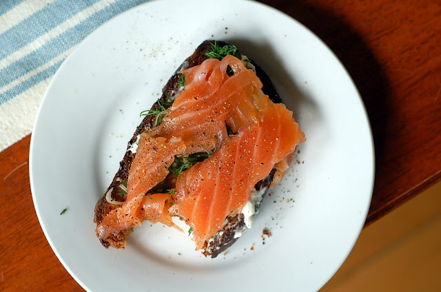 Brunch at home this morning --- Jeff's homemade cured salmon on pumpernickel with cream cheese, scallions, and dill. I couldn't resist taking a bite before photographing it.